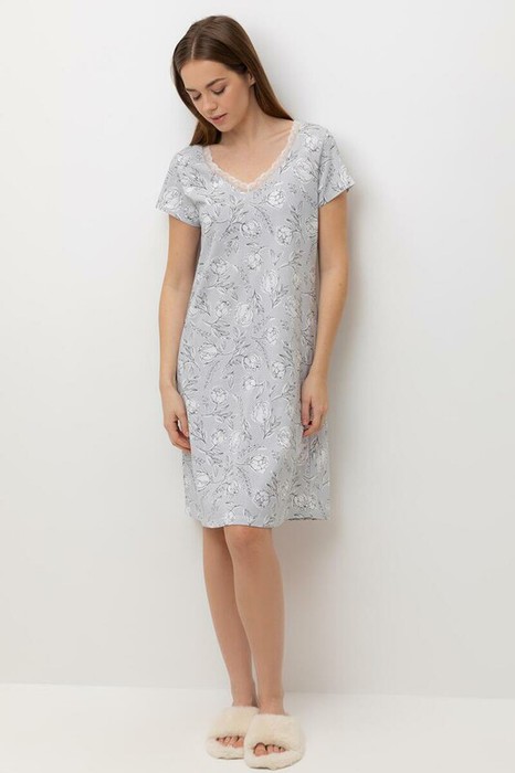Уютная удлиненная сорочка с короткими рукавами из 100% натурального хлопка. Горловина украшена эластичным кружевом. Выполнена из набивного трикотажа супрем с нежным рисунком.