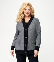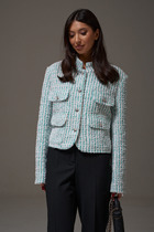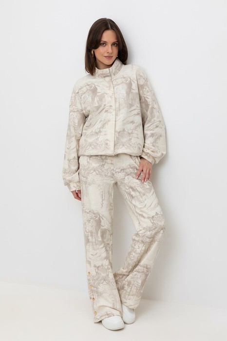 Укороченная трикотажная куртка на молнии с карманами и кулиской по низу. Произведена из мягкого набивного трикотажного футера. Спущенные рукава и манжеты добавляют объем.