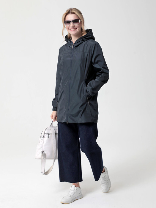 Ветровка прямого силуэта с легким  приталиванием, с втачными рукавами и застежкой на двухзамковую молнию. Капюшон - втачной.   Карманы, расположенные в рельефных швах, застегиваются на молнию. Ширину  изделия по низу можно регулировать затяжкой.  Лаконичная, комфортная модель ветровки полуспортивного стиля подходит для отдыха и повседневного использования.