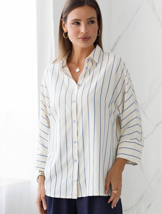 Стильная блузка молочного цвета в голубую полоску идеально держит форму и подчеркивает любую фигуру. Свободный крой с цельнокроеным рукавом 3/4 создает эффект легкой непринужденности и комфорта, а манжеты на рукавах добавляют аккуратности и завершенности образу. Отложной воротник придает блузке классическую нотку, которая гармонично сочетается в деловом образе. Хлопок с добавлением эластана гарантирует отличную посадку, подчеркивая достоинства и скрывая недостатки, при этом сохраняет свежесть на протяжении всего дня. Такая рубашка станет великолепным выбором для тех, кто ценит удобство и стиль одновременно. Модель удачно сочетается с различными предметами гардероба, позволяя создавать стильные и практичные образы в любую погоду.
