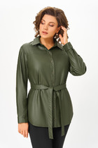 Свободный крой блузки и спущенная линия плеча дарят ощущение легкости и непринужденности, делая образ одновременно женственным и современным. Широкие рукава средней длины гармонично дополняют образ и идеально подходят для полных рук, обеспечивая комфорт, свободу движений и уверенность. Аккуратная застежка на маленькую пуговицу добавляет утонченности, а круглый вырез красиво обрамляет шею, создавая аккуратную линию декольте.