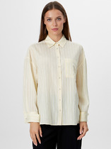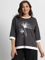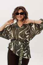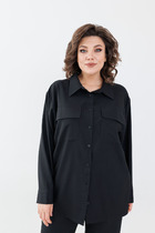 Свободный крой блузки и спущенная линия плеча дарят ощущение легкости и непринужденности, делая образ одновременно женственным и современным. Широкие рукава средней длины гармонично дополняют образ и идеально подходят для полных рук, обеспечивая комфорт, свободу движений и уверенность. Аккуратная застежка на маленькую пуговицу добавляет утонченности, а круглый вырез красиво обрамляет шею, создавая аккуратную линию декольте.