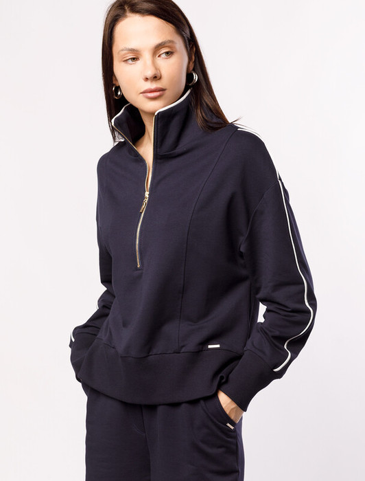 Джемпер с воротом на молнии выполнен из эластичного футера двухнитки. Модель умеренно свободного кроя. По рукавам и воротнику кант из футера контрасного цвета. Изделие дополнено золотистым логотипом бренда. Сочетается в костюме с брюками D44.141, D44.142, шортами D48.009 и юбкой-шортами D46.041. Правила ухода: использовать жидкое моющее средство (гель для стирки), добавлять к нему кислородный пятновыводитель для цветных вещей, и салфетки (защита от окрашивания). Стирка при 30 градусах, отжим на максимальных оборотах.