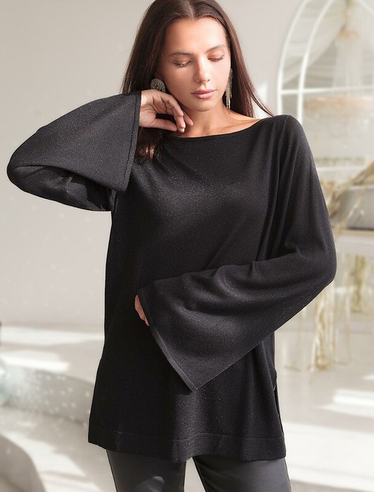 Джемпер тонкой вязки свободного кроя выполнен из вискозы с добавлением мягкого люрекса. Главным украшением служит V-вырез на спинке с золотистой цепочкой. По бокам высокие разрезы дополняют расслабленный силуэт. Нежный трикотаж очень приятно ощущается на теле и совсем не колется. Совет стилиста: чтобы уравновесить и подчеркнуть фигуру, сочетайте джемпер с более узким низом.
