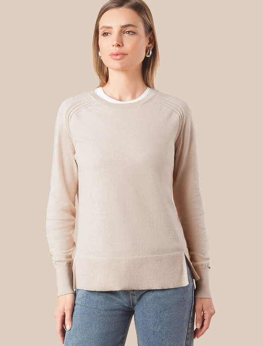 Джемпер тонкой вязки выполнен из хлопка с добавлением кашемира. Лаконичная модель с круглым вырезом дополнена декоративными швами и металлическим логотипом бренда. Мягкая и очень приятная пряжа совершенно не колется, сохраняет тепло при этом не перегревая, гарантируя безупречный комфорт.