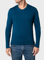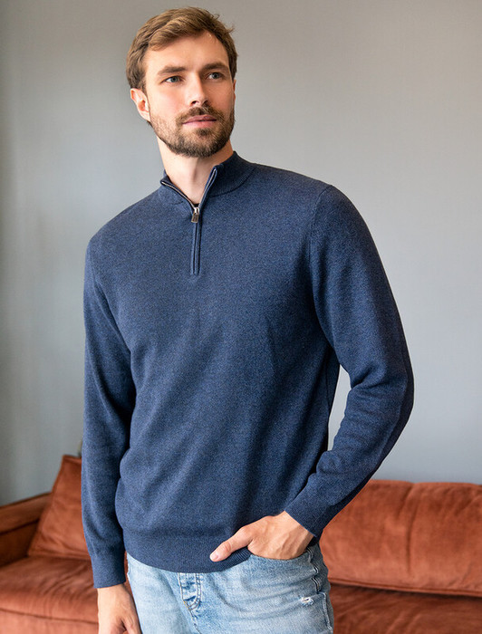 Для изготовления светло-синего джемпера с воротом, застегивающимся на молнию, использовали мягкий трикотаж, связанный из премиального хлопка с добавлением акрила. Двуслойное жаккардовым плетение, вязка с фактурой типа «пике», благодаря чему джемпер имеет среднюю плотность, эластичноть и, при этом, формоустойчивость. Греет за счет иск.шерсти (ПАН) в составе, а премиальный хлопок помогает защитить изделие от скатывания. Такой состав гигроскопичен, греет, но абсолютно не колет.