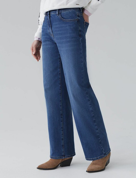 Стильные джинсы трубы синего цвета цвета прямого кроя выполнены из эластичного облегченного денима, что делает их особенно удобными для повседневной носки. Легкая декоративная стирка добавляет интересный акцент и подчеркивает современный дизайн. Джинсы правильного кроя визуально вытягивают силуэт, благодаря эластану в составе аккуратно садятся на любую фигуру, подчеркивая достоинства и обеспечивают максимальный комфорт в течение дня, не сковывая движения. Широкая размерная линейка подходит для разных типов фигур: свободные джинсы комфортны как для обладательниц пышных форм, так и для худеньких. Вы сможете подабрать джинсы на низкий или высокий рост. Джинсы идеально держат форму даже при активном движении и не вытягиваются после долгой носки. Качественная надежная фурнитура  делает эти джинсы премиальными. Широкий подгиб добавляет актуальности — такой тренд отлично сочетается как с обувью на каблуке, так и на плоском ходу. Благодаря универсальному дизайну джинсы легко комбинируется с разными элементами гардеро