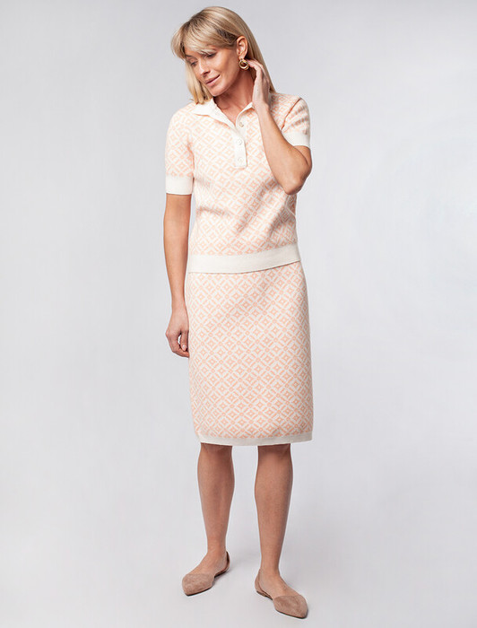 Юбка карандаш выполнена из эластичной поливискозы. Жаккардовое переплетение с геометрическим узором и прямой силуэт визуально стройнят и делают фигуру гармоничной. Мягкое и приятное изделие совершенно не колется и приятное к телу. Сочетайте в костюме с джемпером-поло D39.634 или жакетом D31.388. А также как самостоятельный элемент в комплекте с белой блузкой или светлым жакетом.