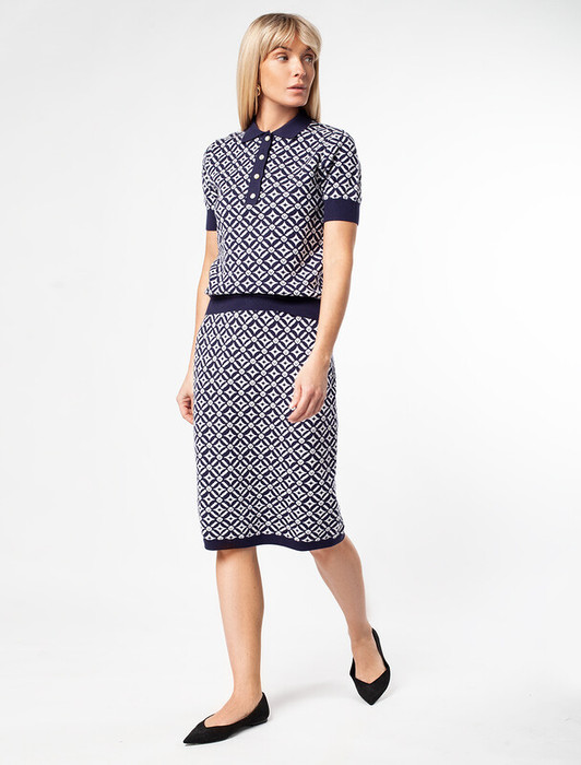 Юбка карандаш выполнена из эластичной поливискозы. Жаккардовое переплетение с геометрическим узором и прямой силуэт визуально стройнят и делают фигуру гармоничной. Мягкое и приятное изделие совершенно не колется и приятное к телу. Сочетайте в костюме с джемпером-поло D39.634 или жакетом D31.388. А также как самостоятельный элемент в комплекте с белой блузкой или светлым жакетом.