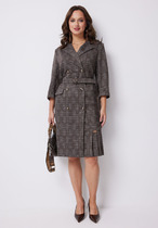 Платье длины мини с воротником поло выполнено из мягкого трикотажа на основе шелковистой эластичной вискозы. Жаккардовое переплетение образует геометрический узор. Застежка на перламутровые пуговицы подчеркивает гладкость пряжи. Контрастный воротник и манжеты делают узор еще более выразительным. Можно сочетать с жакетом D31.388 из жаккардовой коллекции.
