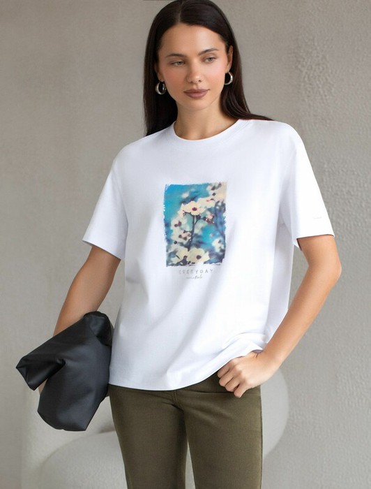 Модная футболка пудрового цвета привлекает внимание своим интересным дизайном и ярким принтом. Благодаря прямому крою изделие комфортно садится на любую фигуру, в том числе на большие размеры, и не сковывает движений. Круглый вырез подчеркивает современный стиль, а натуральный материал из хлопка с добавлением эластана обеспечивает удобство в повседневной носке и приятные тактильные ощущения. Прочность и износостойкая структура позволяют сохранять свежий внешний вид после множества стирок. Принт в виде цветов и надписи нанесен красками с устойчивым покрытием, перевод надписи: Everyday essentials - Повседневные вещи, которые необходимы., Стильная футболка гармонично вписывается в любой гардероб и подойдет для прогулок, отдыха или неформальных встреч. Благодаря особенностям кроя модель хорошо сидит, скрывая недостатки и подчеркивая достоинства. Яркая футболка идеально сочетается с базовыми вещами, позволяя создавать новые интересные образы каждый день.