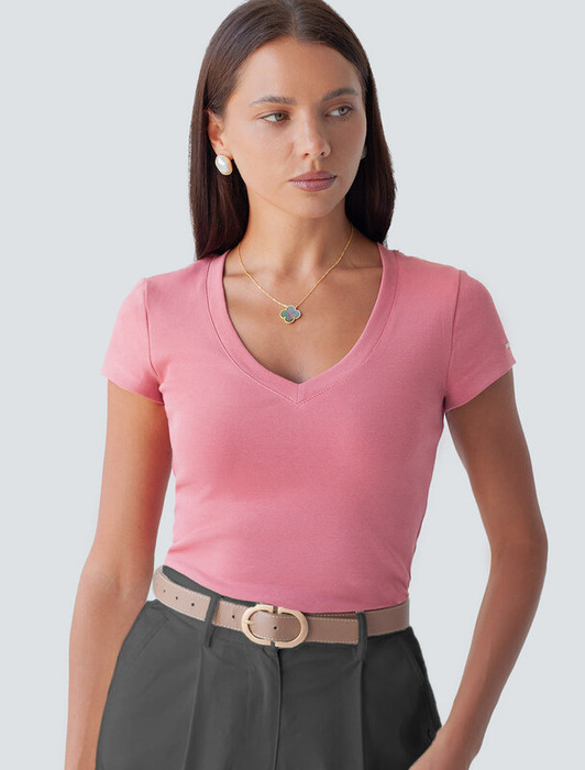 Облегающая футболка с V-образным вырезом цвета фуксия создаст утонченный образ. Идеальная базовая модель для вашего гардероба!  Глубокий V-образный вырез подчеркивает линию шеи и зрительно удлиняет силуэт. Футболка выполнена из хлопка с добавлением эластана, которая мягко облегает контуры тела, подчеркивая достоинства фигуры. Универсальный вариант для создания стильных повседневных образов.