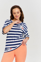 Футболка выполнена из премиального хлопка. Наличие эластана гарантирует абсолютный комфорт и долговечность изделия. Модель в полоску предлагаем сочетать с однотонными вещами базовой палитры. Изделие дополнено металлическим логотипом бренда.