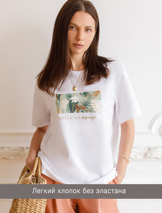 Совместные покупки Магнитогорск Женская одежда Футболки — Vilatte Футболка из премиального хлопка с авторским принтом D49.089 белый_perfec