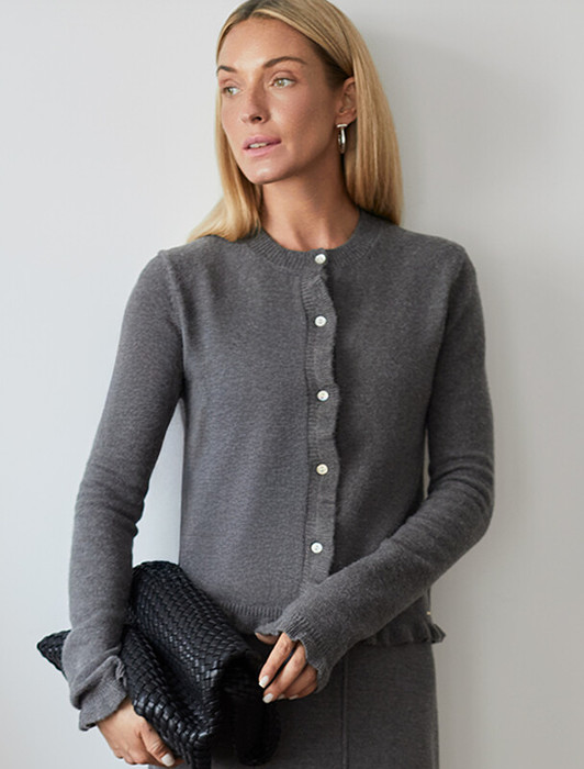 Кардиган выполнен из мягкой меланжевой пряжи с Романтичности прямому силуэту добавляют мягкие воланы по линии пуговиц, на манжетах и краю изделия. Застежка на пуговицы из натурального перламутра. Изделие очень приятное к телу, совершенно не колется и отлично сохраняет тепло. Сочетается в костюме с брюками D38.013, D38.012 и юбкой D36.016