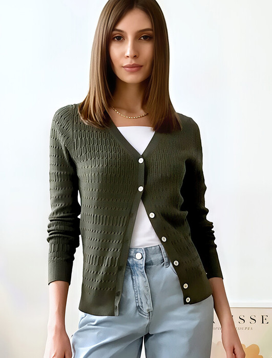 Кардиган тонкой вязки выполнен из хлопка с вискозой. Нежную пряжу, очень приятную к телу, дополняет ажурный узор - плетение косы напоминающий звенья колец. Застежка на пуговицы из натурального перламутра. Модель отлично впишется в весенний и летний гардероб, как самостоятельный верх или накидка на топ или платье. Комфортная длина и крой подходят для любой фигуры.