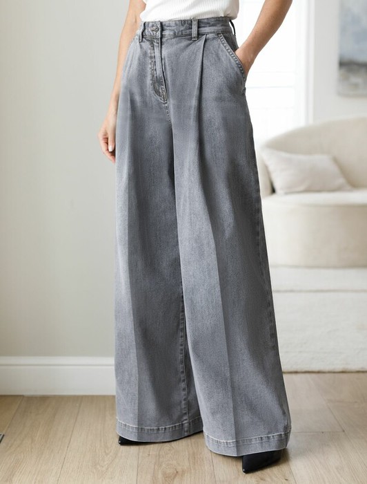 Свободные широкие джинсы серого цвета с защипами из эластичного денима созданы для тех, кто ценит комфорт и стиль в повседневной жизни. Модель отличается свободным кроем, который обеспечивает удобство движений и гармонично подчеркивает современный силуэт. Защипы добавляют изюминку и делают образ более интересным, а также визуально вытягивают силуэт. Благодаря использованию эластана материал сохраняет свою форму даже после длительной носки и многочисленных стирок.