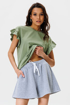 Шорты выполнены из футера двухнитки с эластаном. Модель прямого кроя дополнена боковыми карманами и одним задним карманом. Пояс выполнен из эластичного трикотажа в рубчик. В пояс вставлен плоский хлопковый шнур в тон изделия с серебристыми наконечниками. Изделие дополнено металлическим логотипом бренда. Сочетается в костюме с жакетом D49.078, джемпером D49.079, D49.080 и футболкой D49.081