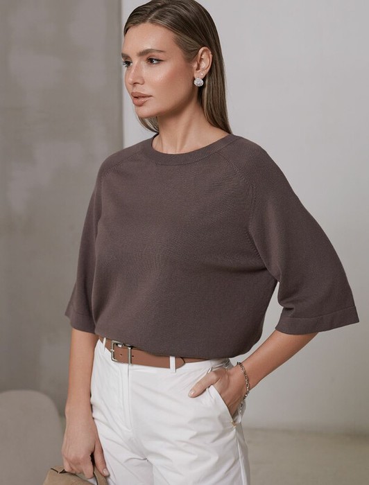 Совместные покупки Магнитогорск Женская одежда Джемперы, свитеры, водолазки — Vilatte Свободный джемпер с рукавом 3/4 тонкой вязки из вискозы D39.403 кофейный