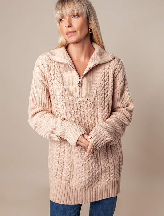 Совместные покупки Магнитогорск Женская одежда Джемперы, свитеры, водолазки — Vilatte Теплый свитер из хлопка с акрилом и золотистой молнией D34.180 св.бежевы