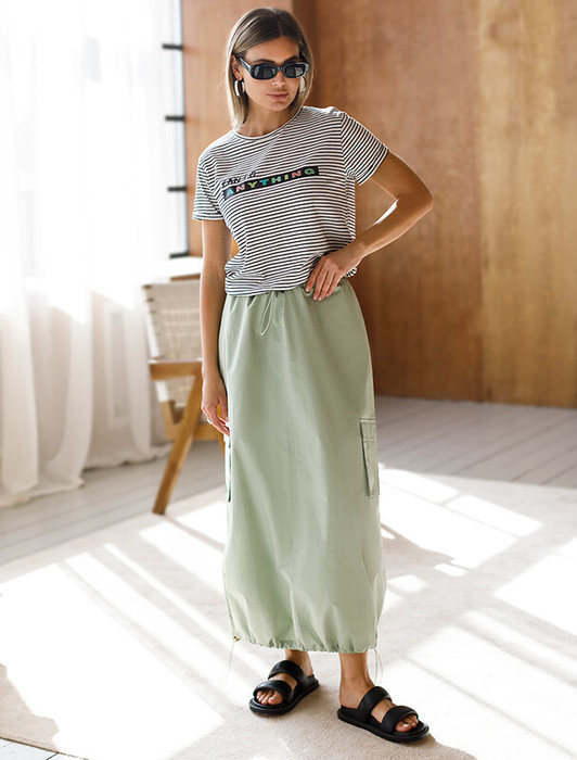 Трендовая юбка «карго» с поясом на резинке выполнена из плотного поплина. Низ изделия сделан на кулиске, что позволяет регулировать форму, используя платье по-разному в зависимости от образа. Материал прочный и износостойкий, но при этом мягкий и удобный, отлично подходит для повседневной носки, гарантируя абсолютный комфорт. Модель дополнена боковыми и двумя накладными карманами.