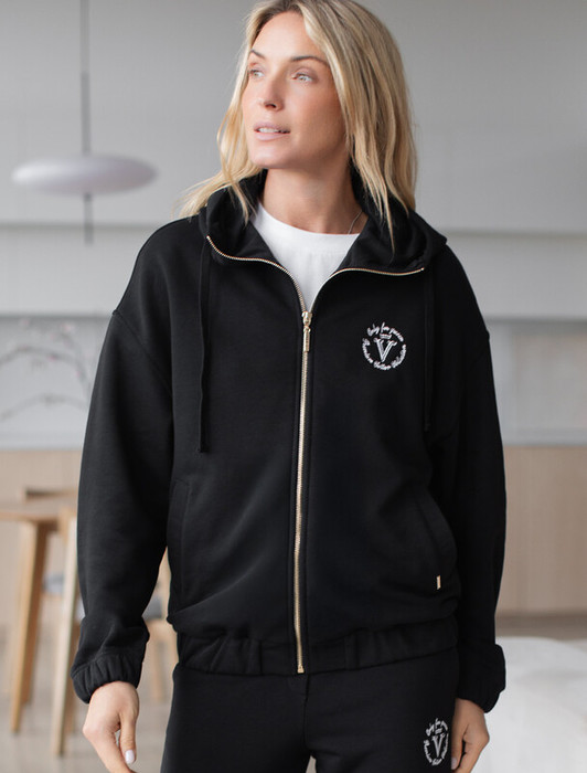 Уютное и стильное зип худи черного цвета на молнии и с капюшоном — идеальный выбор для создания модного повседневного образа в прохладную погоду. Выполнено из эластичного футера двухнитки, натуральный материал дарит комфортное ощущение на протяжении всего дня и отличную воздухопроницаемость. Модель дополнена вышитым логотипом бренда и боковыми карманами. Капюшон со шнуром, резинка по низу и манжеты на рукавах придают джемперу  комфорт. Практичная молния делает худи удобным для быстрого переодевания и добавляет нотку спорт шика вашему стилю.