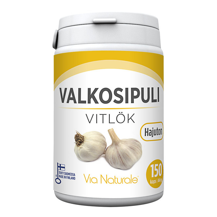Экстракт чеснока Via Naturale (150 капсул) содержит активные вещества в концентрированной форме. Чесночная капсула не вызывает типичный чесночный запах изо рта, который обычно вызывают соединения серы, содержащиеся в чесноке. Чеснок содержит, помимо прочего, серную аминокислоту аллиновую, которая превращается в аллицин, когда структура чеснока разрушается. Состав: подсолнечное масло, желатин (свиной), накопитель влаги (травяной глицерин), экстракт чеснока (сахарный конвейер), антиоксидант (альфатокоферил), стабилизатор (диоксид кремния). Рекомендуемая суточная доза: 1 капсула в день во время еды. Продукт не содержит подсластителей, глютена и лактозы. Не содержит дрожжей, молочных продуктов и сои. Страна производитель: Финляндия. Импортер / продавец: Via Naturale Oy, Kalliotie 2, 04360 Tuusula Не следует превышать рекомендованную суточную дозу. Пищевая добавка не заменяет разнообразное и сбалансированное питание или здоровый образ жизни. Храните в недоступном для детей месте.