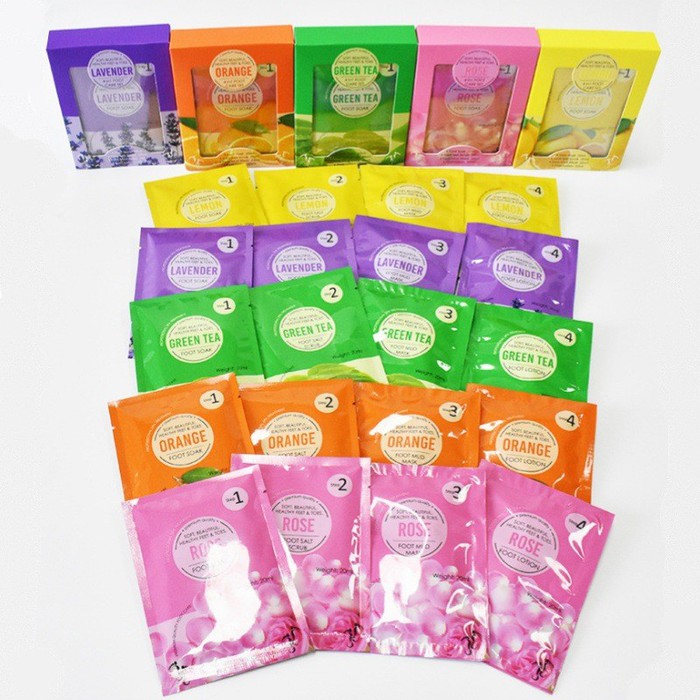 Побалуйте себя спа-процедурой для ног у себя дома! 4-х этапный комплекс по уходу сделает ваши ноги мягкими, красивыми и здоровыми., В комплект входит:, Способ применения:ШАГ 1: Наполните ванночку для ног теплой водой. Высыпьте в воду желе из пакетика номер 1. Тщательно размешайте до образования желе. Окуните ноги в ванночку на 3-5 мин. Мягко помассируйте ноги, чтобы отшелушить кожу ног.ШАГ 2: Высыпьте в ванночку пакетик номер 2 с солевым скрабом и размешайте. Желе растворится и снова станет жидким. Замочите ноги еще на 3-5 минут в богатой минералами ванночке, позволяя минералам расслабить ваши ноги и кожу. Слейте воду из ванночки для ног.ШАГ 3: Нанесите грязевую маску из пакетика 3 на ступни, пальцы ног и голени. Оставьте грязевую маску питать, успокаивать и расслаблять кожу на 15 мин. Тщательно смойте теплой водой.ШАГ 4: Массирующими движениями нанесите лосьон из пакетика 4 на стопы и голени до полного впитывания.