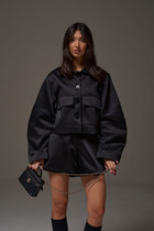 Жакет полуприлегающего силуэта, на подкладке, выполнен из костюмной однотонной ткани, в качестве отделки использована костюмная ткань в полоску.