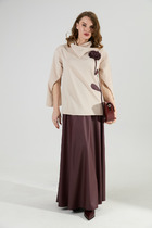 Его прямой силуэт со спущенным плечом и изящными разрезами по бокам струится легко и свободно, подчеркивая достоинства, не сковывая движений. Глубокий V-образный вырез горловины добавляет образу женственности и строгой элегантности, а классическая застежка на красивые пуговицы завершает безупречный вид.