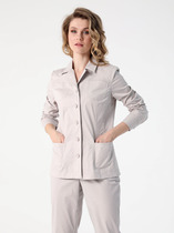 Жакет прямого силуэта, на подкладке. Воротник стояче-отложной пиджачного типа. По переду - двубортная застежка на петли и пуговицы, нагрудные вытачки и накладные карманы. Спинка со средним швом. Рукав втачной длинный двухшовный. Полочку жакета украшает декоративная съемная рюша на пуговицах.