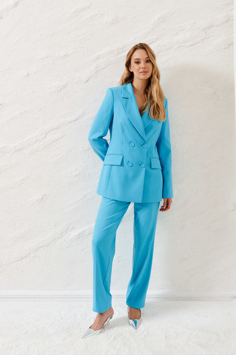 Жакет полуприлегающего силуэта выполнен из полотна насыщенного голубого цвета. Характеристики: полуприлегающий силуэт, подкладка, подплечники, двубортная застежка, миниатюрные не функциональные пуговички по переду изделия, воротник с остроугольным лацканом, по переду карманы с клапаном, рукав втачной, по низу рукава вертикальный разрез, разрез на пуговичках. Длина жакета 69 см, длина рукава 63.