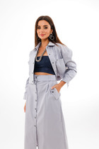 Жакет полуприлегающего силуэта выполнен из костюмной ткани. Характеристики: полуприлегающий силуэт, подплечники, подкладка, остроугольный лацкан, застежка центральная на петли пуговицы, по передней части изделия карманы с клапаном, рукав втачной, по низу рукава нашиты пуговички. Длина по спинке 72 см, длина рукава 76 см