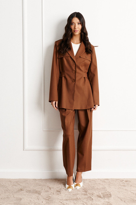 Стильный жакет прямого кроя выполнен из костюмной ткани цвета шоколад. Характеристики: прямой крой, подкладка, подплечники, отложной воротник с лацканом, застежка центральная на петли пуговицы, по переду имитация карманов с клапанами, по линии талии пояс завязывающийся по спинке. Длина по спинке 74 см, длина рукава 64 см