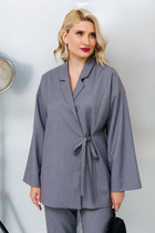 Жакет прямого свободного кроя выполнен из костюмной ткани. Характеристики: прямой свободный крой, подкладка, подплечники, воротник с остроугольным лацканом, застежка центральная на петлю - пуговицу, по переду функциональные карманы с клапаном, рукав втачной, по низу рукава нашиты пуговички, спинка со средним швом, в среднем шве шлица 48 см. Длина по спинке 77, длина рукава 62 см.