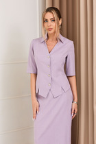 Жакет прямого свободного кроя. Выполнен из костюмной ткани в цвете хаки с полоской красного цвета. С подкладкой. Воротник отложной, с лацканами. Рукав втачной, немного спущен. Есть подплечники. По переду карманы с клапаном (функциональные). В среднем шве заднего полотна высокая шлица (48 см). Застёжка центральная пуговицы. Длина спинки 76 см. Длина рукава от линии втачиваня 61 см. В комплекте пояс из основной ткани