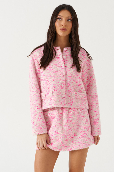 Жакет уороченный прямого кроя, выполнен из твидовой ткани бежево-розового цвета. Характеристика: прямой крой, овальная горловины, центральная застежка на петли-пуговицы, спереди изделия имитация карманов, подклад. Длина рукава от края горловины 73см. Длинаизделия по центру спинки 51см.