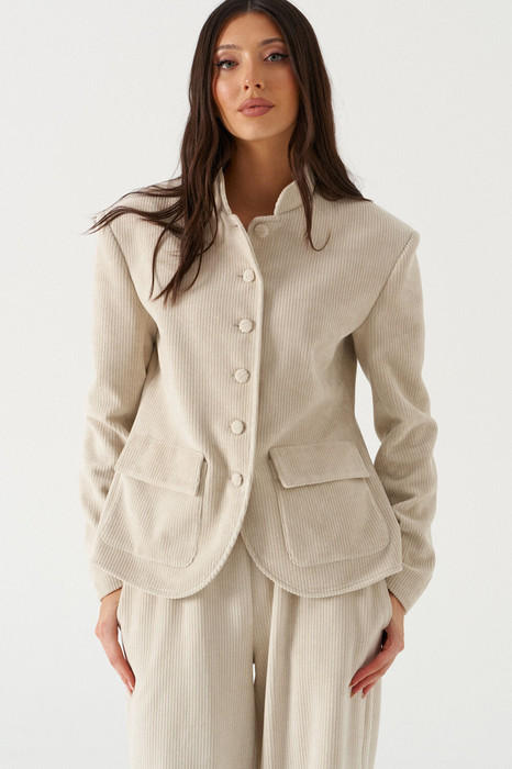 Жакет прямого кроя, выполнен из трикотажного полотна штукса молочного цвета. Характеристики: прямой крой, на брендированной подкладке, воротник стойка, застежка центральная бортовая, застегивающаяся на пробивные петли и пришивные пуговицы, накладные карманы с клапанами, спинка цельная, талиевые выточки, рукав втачной, подплечник. Длина рукава от шва втачивания 62см. Длина изделия по центру спинки 62см.
