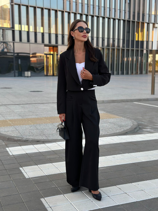 Однобортный жакет на подкладке, свободного силуэта. Рукава втачные одношовные, обработаны шлицей. Рукава обработаны съёмными деталями из атласной ткани.