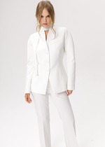 Жакет 2-бортный, на подкладке. Рукав длиннный, втачной, одношовный, по окату собран складками дляя увеления объёма. Обработаны талиевые вытачки по переду и спинке изделия