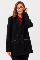 Жакет однобортный, на подкладке, выполнен из эко-кожи. Обработан молнией разъёмной молнией по центру переда, закрывающейся планкой с пуговицами. Воротник тложнй, рубашечного типа. Рукава втачные одношвные, прямые. По передним половинкам обрабтаны накладные карманы с клапаном.