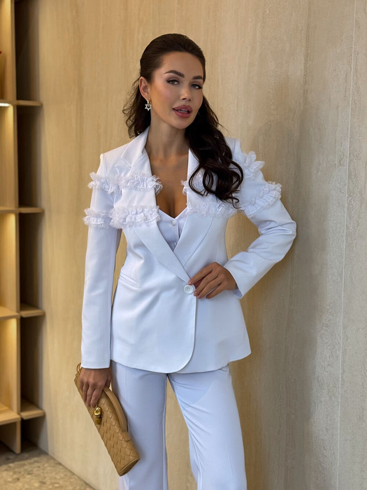 Этот жакет - настоящая жечужина в гардеробе. Небанальный вариант застёжки сбоку на лицевой стороне, и потайной пуговицей внутри изделия придаёт жакету характер, подчёркивает силуэт и линию талии. Жакет выгодно акцентирует фигуру, создавая утончённый и женственный образ. Благодаря декоративным рюшам из вуали, он легко станет центральным элементом образа. Карманы с клапанами.