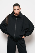 Жакет двубортный из текстильной ткани, свободного кроя, на подкладке. По переду имеется отрезной бочок и вертикальные вытачки. С прорезными карманами с клапаном и двумя обтачками. Спинка цельная. Воротник пиджачного типа. Рукав двухшовный, по низу рукава обработана шлица на петли-пуговицы. Длина рукава 63 см, длина по спинке 74 см.