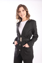 Жакет женский полуприлегающего силуэта выполнен из костюмной ткани с добавлением эластана на подкладке. Воротник втачной с отложным лацканом, рукав двухшовный с разрезом, на полочке обработаны функциональные карманы с листочкой. Застегивается на завязки, длина жакета 75 см, длина рукава 53 см.
