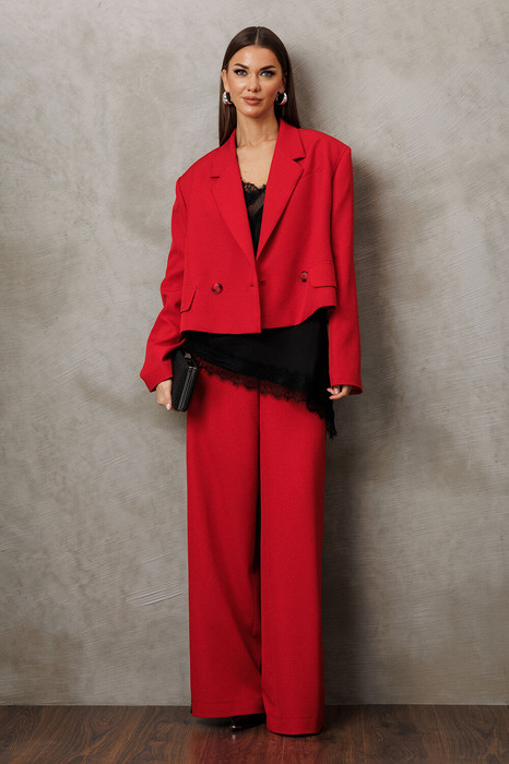 Жакет, укороченный прямого силуэта, двубортное с втачным двухшовным рукавом. Полочка с застежкой на петлю-пуговицу и имитацией кармана с клапаном. Спинка с центральным швом. Жакет с отрезным бочком, переходящим на полочку и на спинку. Воротник пиджачного типа с отрезной стойкой. Жакет на подкладке.