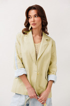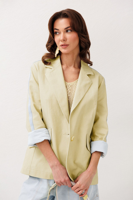 Жакет из джинсовой ткани с велюровым эффектом полуприлегающего силуэта с втачным двухшовным рукавом с лампасом из отделочной ткани. Полочка с центральной застежкой на петлю-пуговицу, вытачкой и имитацией кармана с клапаном. Жакет с отрезным бочком, переходящим на полочку и на спинку. Воротник пиджачного типа с отрезной стойкой. Рукава жакета на подкладке.