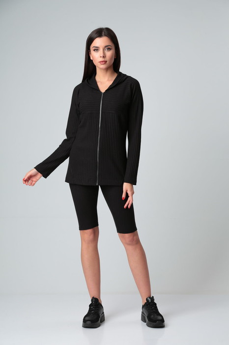 Кофта женская из трикотажного полотна с центральной бортовой застёжкой на молнию. Перед с отрезными бочками внизу с кокеткой переходящей в рукав. Спинка тоже с кокеткой, переходящей в рукав. Воротник-капюшон с кулисой и шнуром. На правом рукаве по низу декоративная нашивка.