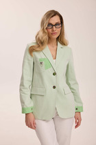Джемпер выполнен из трикотажного полотна с блеском. Джемпер полуприлегающего силуэта, длиной выше линии бедер. Воротник стояче-отложной. Плечевой шов удлинен. Рукав втачного покроя, одношовный. Застежка по планке на петли и декоративные пуговицы.