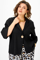 Однобортная застёжка на пуговицу, рельефные линии по полочке и спинке подчёркивают фигуру. Декоративная трепка по краю борта, низу изделия и рукавам добавляет фактурности и оригинальности.