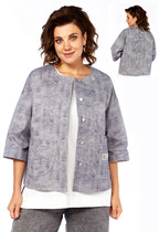 Жакет полуприлегающего силуэта, на подкладке; воротник пиджачного типа; рукава втачные; по переду функциональные прорезные карманы; застежка двубортная на петли и пуговицы.